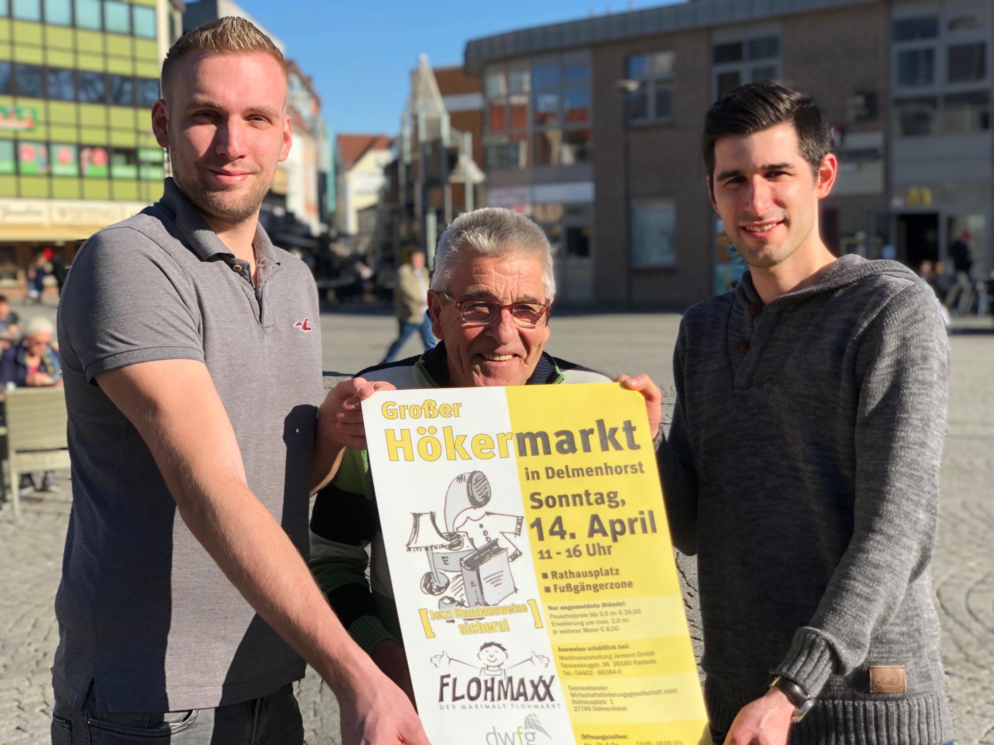 Am 14. April wird in der Innenstadt wieder gefeilscht und gehökert. Marvin Oetken, Franz Beermann (Marktveranstaltungen Janssen) und Gerrit Eickworth von der dwfg (von links) freuen sich schon auf den Termin. Die Standausweise gibt es ab 4. März. Foto: dwfg / Eyke Swarovsky