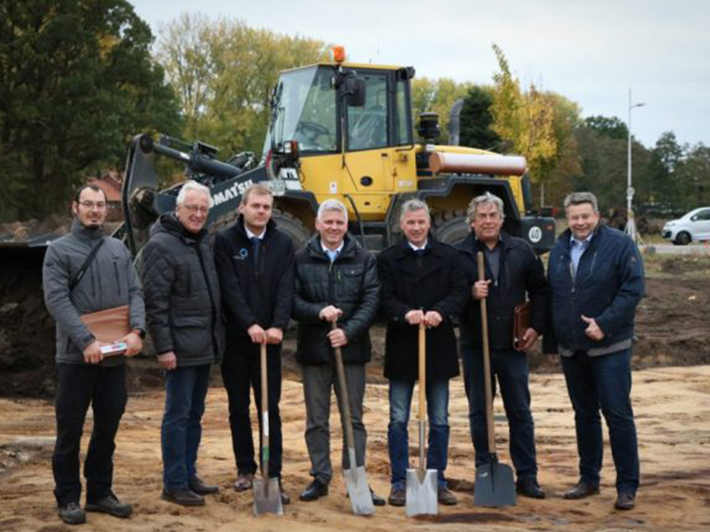 Mit Radlader und Spaten geben sie den Startschuss für den Neubau an der Stickgraser Allee: (von links) Architekt Dipl. Ing. Richard Kodalle, Oberbürgermeister Axel Jahnz, Wille-Geschäftsleitung Chris Ahlers und Tom Wille, Wille-Geschäftsführer Frank Wille, Architekt Dipl. Ing. Rainer Speckmann und dwfg-Geschäftsführer Axel Langnau. Foto: dwfg/Eyke Swarovsky
