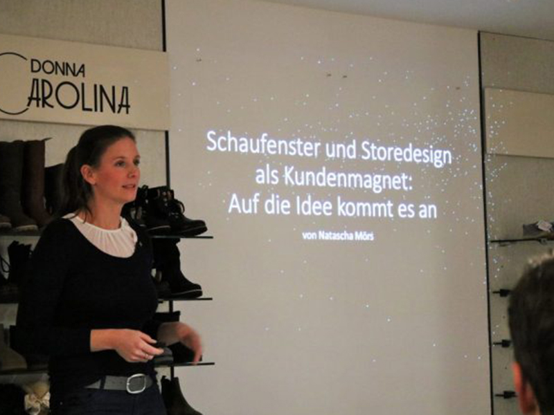 Im Hauptteil der Veranstaltung referierte Natascha Mörs vom Online-Magazin iXtensio. Sie hatte allerlei eindrucksvolles Bildmaterial mitgebracht. Präsentiert wurde dies mitten in den Verkaufsräumen des Delmenhorster Traditionsunternehmens „Schuh Gerdes“ an der Langen Straße, das dort im nächsten Jahr bereits sein 100-jähriges Bestehen feiert. Näher am stationären Einzelhandel konnte die Veranstaltung kaum stattfinden. Vor dieser Kulisse wurden zunächst verschiedenste Beispiele zur Shop- und Schaufenstergestaltung präsentiert, aus Europa und aller Welt. Die Möglichkeiten reichten hier von viel bestaunten, raffinierten aber schlichten Designs bis zu absoluter High-Tech oder wahren Innenarchitektur-Wundern. Danach wurde in einer kurzen Zusammenfassung auf die wichtigsten Aspekte eingegangen und auch festgestellt, dass für jeden Einzelfall abgewogen werden muss, welche Präsentationsart sich für welches Geschäft oder Produkt eignet.